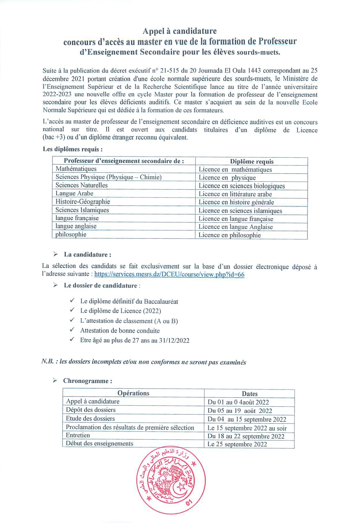 Archives BENABED Fatma 2 août 2022 Affichages : 1239 Appel à candidature Appel à candidature concours d'accés au master en vue de la formation de professeur d'Enseignement Secondaire pour les éleves sourds.