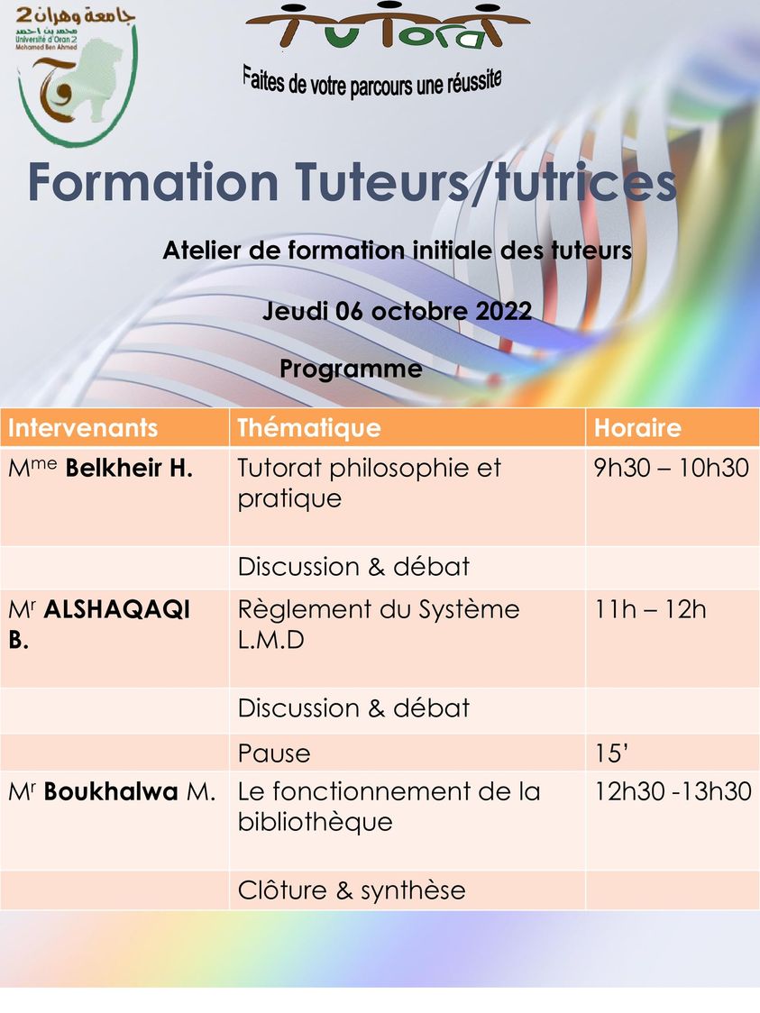 Archives Previous Next BENABED Fatma 17 octobre 2022 Affichages : 421 Formation Tuteurs et Tutrices Atelier de formation initiale des tuteurs 06 octobre 2022 Auditorium AMEUR M'hamed Université d'Oran2 Mohamed Ben Ahmed